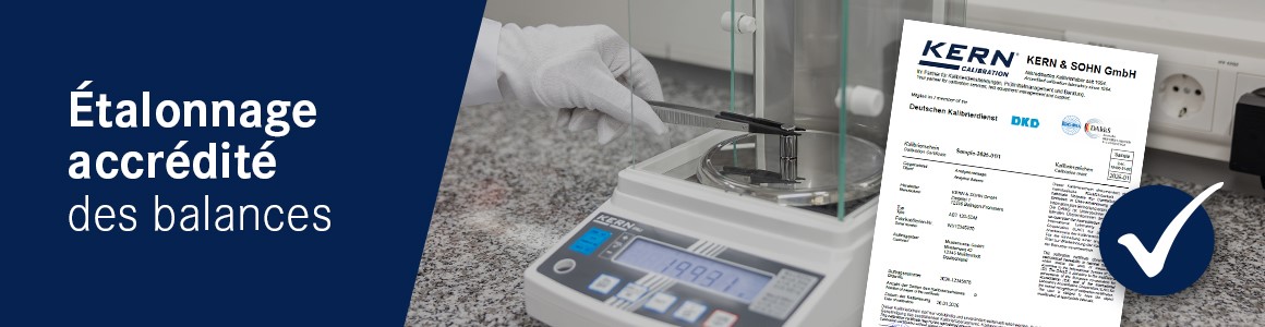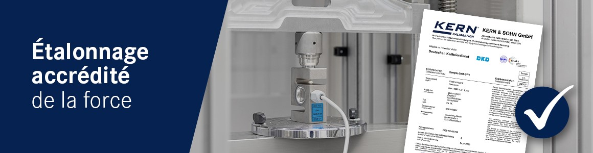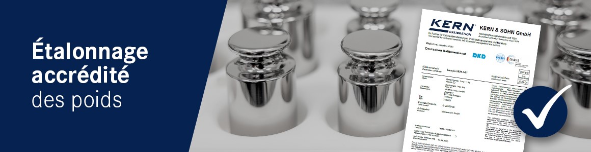 KERN incarne un partenaire fiable non seulement grâce à sa vaste gamme d'appareils de mesure, mais aussi à son laboratoire ultramoderne et accrédité DAkkS depuis 1994. Des équipements de pointe et un haut degré d'automatisation permettent de réaliser l'étalonnage DAkkS des balances, des poids de contrôle, d'appareils de mesure de force, de température et d'humidité presque 24H/24 et 7j/7. Outre l'étalonnage, nous assurons aussi l'étalonnage périodique de vos balances et poids (E2 - M1). Vous trouvez donc sous une même enseigne vos instruments de mesure et vos services de contrôle. Rapide et précis!