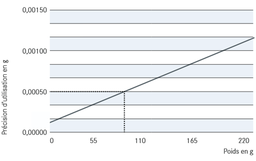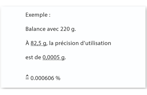 Dans l’hypothèse de conditions environnantes identiques (tirant d’air, secousses, …) telles que présentes au moment de l’étalonnage sur le lieu d’installation de la balance et de variations de température ambiantes estimées de X kelvin (°C) avec un coefficient de température attribué à la balance (in ppm/K), il en résulte une certaine précision d’utilisation. Cette précision d’utilisation est calculée selon EURAMET/cg-18.